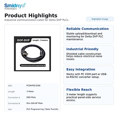 PLC Programming & Compatible Cables are used to connect PLCs with programming devices, HMI panels, I/O modules, and control panel accessories. These cables are commonly used for program upload/download, monitoring, commissioning, troubleshooting, and panel wiring interconnections.